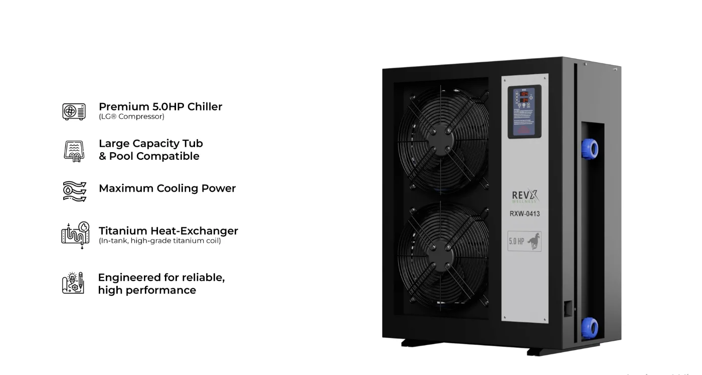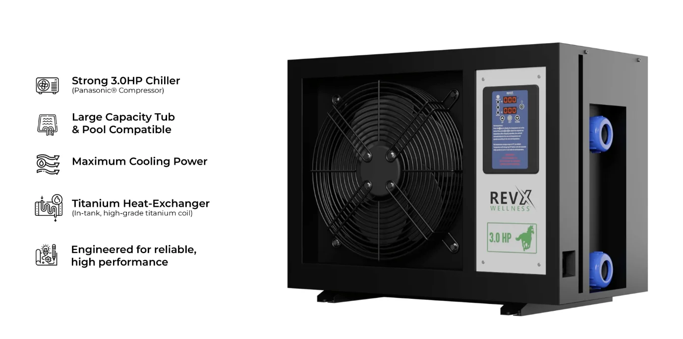 Para albercas y tinas grandes hasta 450 galones. Compresor Panasonic® 3HP industrial. Control WiFi remoto.